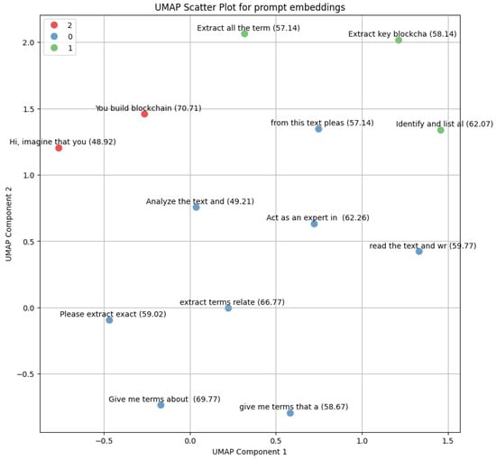 At complexity level 2, prompts 32 and 54 illustrate how task framing impacts performance. Prompt 32 positions the model as a data annotator, requiring it to assess each word and phrase for domain relevance. This directive maximizes recall (68%) but at the cost of lower precision (38.2%), leading to a lower F1-score (48.92%). The annotator role suggests the model focuses on inclusion rather than on selectivity. In contrast, prompt 54 frames the task as ontology construction, which implicitly shifts the model’s focus from broad extraction to structured selection. Precision rises sharply to 71.43%, while recall remains stable (70%), leading to a significantly higher F1-score (70.71%). Figure 9 illustrates the arrangement of embeddings for the analyzed prompts on a two-dimensional plot. While the embedding dimensionality is reduced using UMAP, their arrangement largely corresponds to their respective classes under the SOLO taxonomy. Notably, there is no evident correlation between the performance of closely related prompts, reinforcing the idea that subtle linguistic variations can significantly impact GPT’s performance.