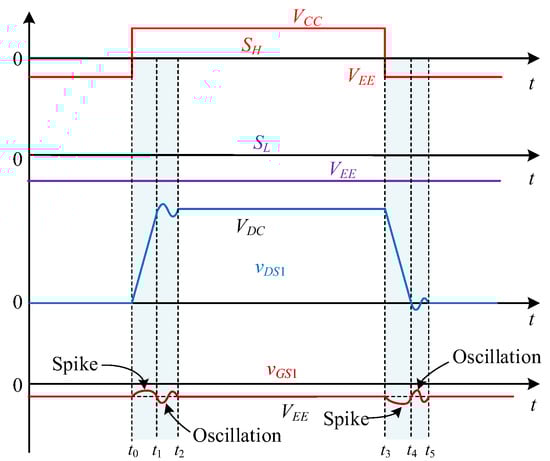 From the preceding analysis, crosstalk parasitic oscillation occurs during switching dynamic processes, primarily triggered by variations in the drain voltage vDS1. Owing to their inherently higher dv/dt capability compared to Si IGBT, SiC MOSFETs exhibit pulsed drain-source voltages that act as the dominant interference source for passive devices’ gate voltages. Specifically, the pulsed drain voltage of SiC MOSFETs is the primary interference source of the voltage oscillation at the passive device’s gate, which contains abundant harmonics in high-frequency bands during high-speed switching. These dynamics are categorized into two phases: The first phase involves a typical interference-induced gate voltage spike, occurring during [t0, t1] and [t3, t4]. The second phase consists of high-frequency crosstalk parasitic oscillations, occurring during [t1, t2] and [t4, t5].