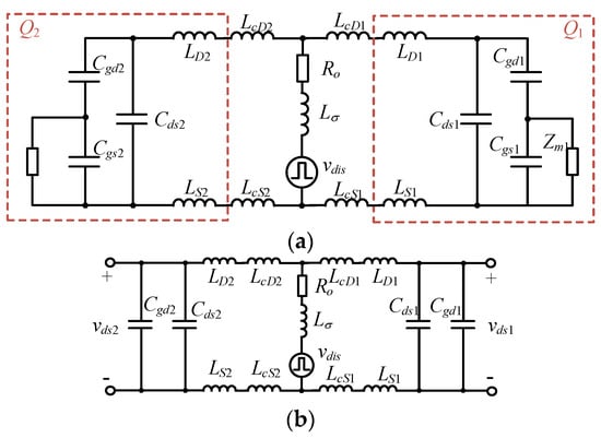 As shown in Figure 3a, the voltage across Cds1 is vds1, the voltage across Cds2 is vds2, the voltage at the midpoint between Cgd1 and Cgs1 is vm1 and the voltage between Cgd2 and Cgs2 is vm2. In numerical terms, the voltages vm1 and vm2 in the drive loop are much smaller than those of the power loop vds1 and vds2. Therefore, to demonstrate the behavior of the power loop, vm1 and vm2 are treated as 0 for simplification. Thus, the part from vdis to vds1 and vds2 can be approximated to be independent of Zm1 and Zm2 (the drive loop impedances of two parallel devices). Finally, the simplified equivalent circuit in Figure 3b is derived.