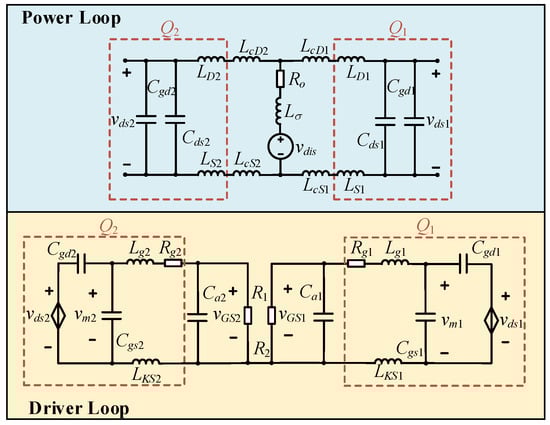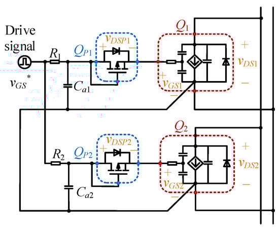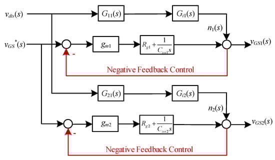 Furthermore, based on the impedance relationships in the equivalent circuit shown in Figure 5, the transfer functions GD1(s) and GD2(s) from vc (the drive voltage at the common terminal of the parallel devices) to vGS1 and vGS2 can be obtained: