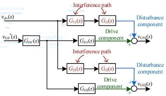 Figure 6 presents the block diagram corresponding to Equation (12), illustrating both interference propagation paths and complete gate voltage expressions. Here, the disturbance component refers to the portion of the gate voltage vGS perturbed by the disturbance source via interference coupling. Conversely, the drive component describes the ideal charging and discharging process of the drive signal vGS* through the drive resistor to the respective gate voltage in the ideal case, without disturbance effects. The complete gate voltage expressions are obtained by summing the disturbance and drive components for each device.