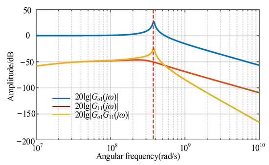 Taking the drive resistor R1 = 10 Ω, R2 = 10 Ω and gate terminals auxiliary shunt capacitance Ca1 = 1 nF, Ca2 = 1 nF, it is estimated that the power loop inductance is Lσ = 20 nH, the power loop stray resistance (including the devices’ on-resistance and the line resistance) is about Ro = 0.5 Ω, and the device pin inductance is about 10 nH. From Equation (7), the transfer function amplitude of the gate voltage disturbance for one of the parallel devices can be obtained, as shown in Figure 7. It should be noted that this figure is a Bode plot; hence, the horizontal axis uses the angular frequency (rad/s) instead of the frequency (Hz).