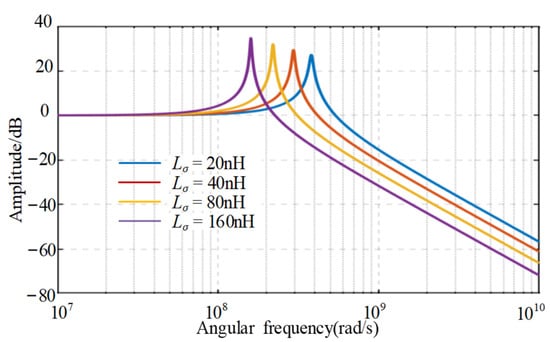 As Figure 8 reveals, increasing Lσ from 20 nH to 160 nH, its undamped natural frequency decreases from 60.723 MHz to 25.48 MHz, a decrease of 58.03%, and the resonance peak increases from 27.1105 to 34.7, an increase of 27.3%. It should also be noted that the 160 nH stray inductance is very large and not ordinary in application. However, this paper only uses this value to demonstrate that the resonant frequency will gradually decrease with the increase in stray inductance.