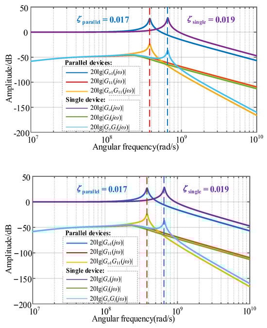 Using the same parasitic parameters as the parallel configuration, the gate voltage disturbance transfer function amplitude is derived from Equation (16), as shown in Figure 9. In addition, from Equations (14) and (18), and by combining the parameters in Table 1, it can be calculated that, compared with the power loop transfer function Go(s) of a single device, the power loop transfer function G11(s) of the parallel devices has a lower damping ratio. At their respective resonance frequencies, the damping ratio of the transfer function of the parallel devices is 0.017, while that of the single device is 0.019, as shown in Figure 9. This reduced damping ratio is coupled to the gate voltage through the drive loop. Moreover, the parallel devices have a lower resonance frequency of 105.41 MHz, while the resonance frequency of the single device is 60.37 MHz. The cutoff frequency of the power loop transfer function of the parallel devices is also lower. Compared with that of the single device, the cutoff frequency of the parallel devices is reduced by 42.63%, containing a lower oscillation frequency component. Furthermore, compared with the drive loop transfer function Gi(s) of a single device, the drive loop transfer function Gi1(s) of the parallel devices also has a lower damping ratio and less attenuation in the same frequency band.