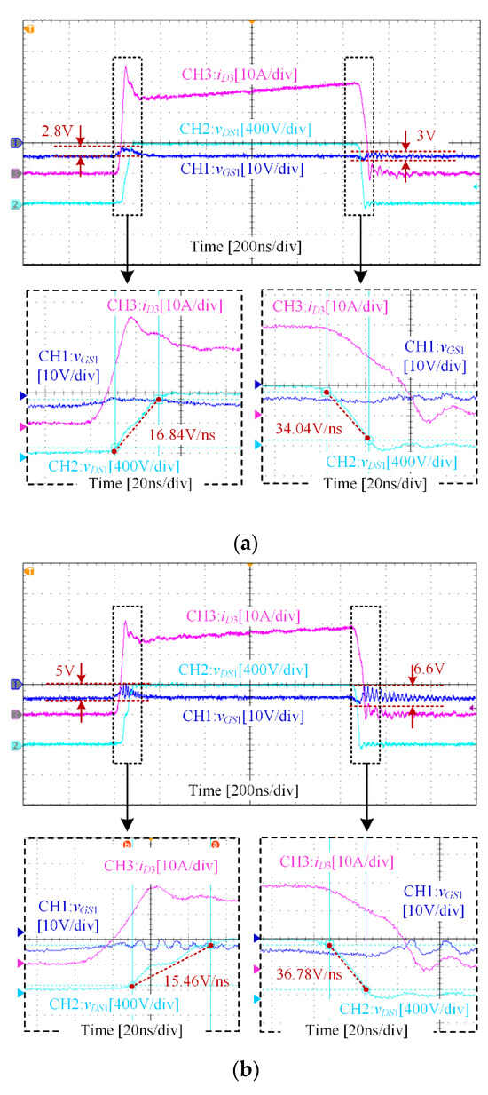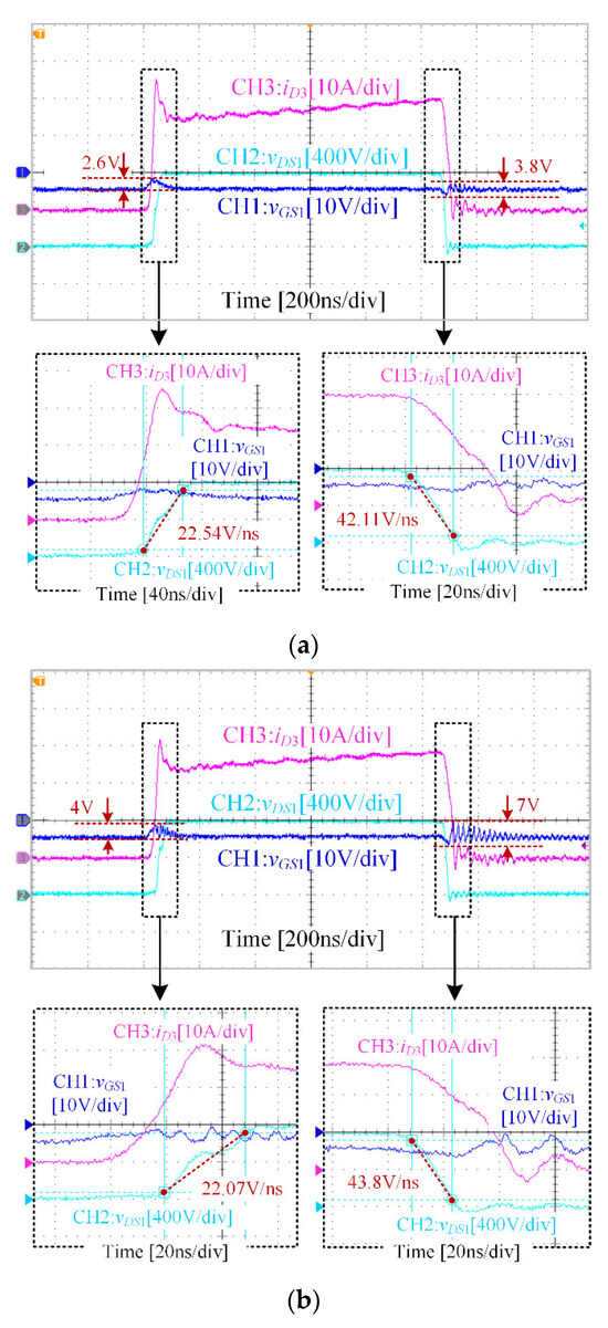 Figure 13a demonstrates the waveforms of a single device under CGD Case 1. During the turn-on transient of the active device, the peak-to-peak crosstalk parasitic oscillation is 2.6 V. During the turn-off transient, the peak-to-peak crosstalk parasitic oscillation is 3.8 V. The corresponding dv/dt is 22.54 V/ns and 42.11 V/ns, respectively, which is a very high switching speed of over 20 V/ns. Under this condition, the speed/crosstalk ratio is KSC = 11.08.