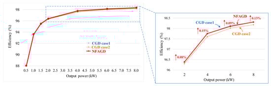 As it is shown in Figure 16, the converter under the proposed NFAGD application strategy has a similar efficiency to CGD Case 1 across the entire operation range, due to the similar switching speeds of the two gate drives. Compared to CGD Case 2, the converter shows an efficiency improvement of about 0.08% at a light load of 2 kW under the drive of the proposed NFAGD application strategy, saving about 1.6 W switching loss; at a half load of 4 kW, the NFAGD converter has an efficiency improvement of about 0.15%, saving about 6 W switching loss; at full load 8 kW, the converter shows an efficiency improvement of about 0.13% under the drive of the proposed NFAGD application strategy, saving about 10.4 W switching loss.