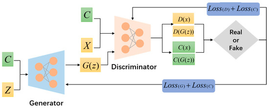 - Second, the encoder and generator are jointly trained. During this process, the input data and class label are used as the input for the encoder, while the generator produces the output . The training objective combines four key components: (1) a reconstruction loss measuring the discrepancy between original and reconstructed data, (2) the KL divergence of the encoder’s output , (3) the discriminator’s evaluation score of , and (4) the classification loss from the auxiliary classifier’s output.