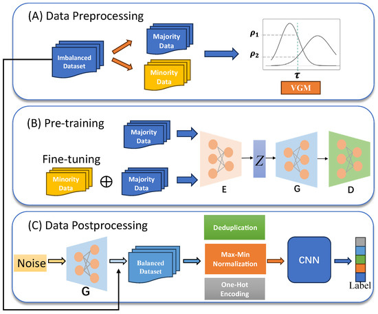 The proposed M2M-VAEGAN-IDS architecture is shown in Figure 4. It is briefly divided into three modules: (1) data preprocessing, (2) pre-training and fine-tuning, and (3) postprocessing with CNN classification.