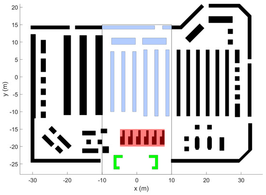 Since the target environment is mainly composed of repetitive shelves, an environment with strong characteristics was selected for this study. Hence, only the colored structures in the central part of Figure 1 constitute the simulation environment. Here, the shelves and counters are indicated in blue, the entrance is at the bottom (near m) between the green structures, and the checkout area is indicated in red. All the items that need to be shopped are expected to be present on the shelves. Also, a CartBot is considered to be capable of billing the items as they are placed in it. Hence, the checkout area is set as off-limits for the CartBot.