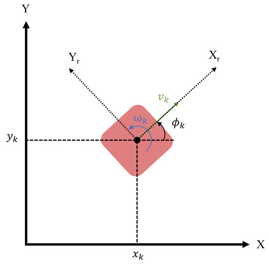 where subscript k indicates a particular time step, while is the time interval. Also, x and y represent the Cartesian position of the mobile robot, with the heading angle , and v and are the linear and angular velocities of the robot, respectively. The unicycle model is simple and easy to implement compared to the actual mobile robot kinematics or dynamics. This approach’s primary advantage is that it can work with any real mobile ground robot as their dynamics equation can be modified or equated to vary based on the linear and angular velocities.