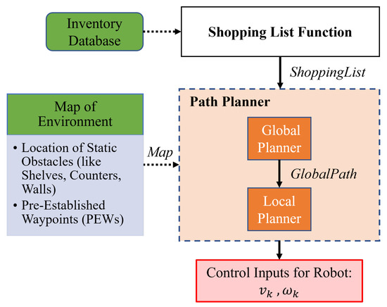 Figure 4 shows the overview of the CartBot’s framework. This framework consists of a Shopping List Function that creates a shopping list, which in turn acts as an input to the Path Planner. The Path Planner computes the optimal route of traversal for the CartBot with static and dynamic obstacle avoidance. The Inventory Database containing all the items and their location, and the map of the store environment, called Map, are the environment-specific static inputs for the system. In a real-world application of the system, a shopping list would be created by every customer, and the CartBot would generate navigation plans uniquely based on it. For the scope of this work, a Shopping List Function will pick N random items and their 2D locations from the Inventory Database and create a ShoppingList. This ShoppingList is the input to the Path Planner along with the Map. The Path Planner comprises a Global Planner and a Local Planner. The Global Planner, which will be explained in Section 3.2, determines the shortest path, called GlobalPath, to reach all the necessary items while avoiding all the mapped static obstacles. Next, the Local Planner aims to traverse the GlobalPath while making real-time adjustments based on the static and dynamic obstacles to avoid collisions. Here, control inputs, and , are generated for the CartBot to perform collision-free navigation and will be discussed in Section 3.3.