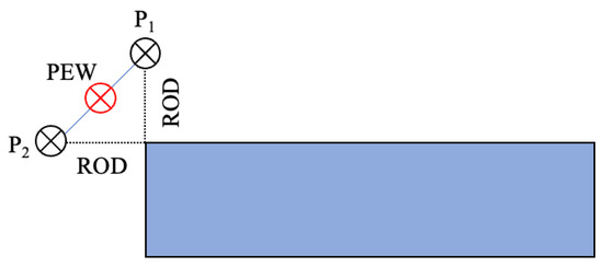 The shopping environment has many shelves, and it is impractical to assume a simple Euclidean distance as the travel distance from one item location to the next. Therefore, this study considers using Pre-Established Waypoints (PEWs) placed at the corners of each shelf or structure. PEWs are additional intermediate waypoints created to connect the various regions of the shopping environment from where the desired items need to be picked. As shown in Figure 5, for each vertex of a shelf, points and are fixed with Robot Offset Distance, called ROD, along the two edges of the vertex. Then, the midpoint of these points is calculated; this point is coined as a PEW and is saved in the Map.