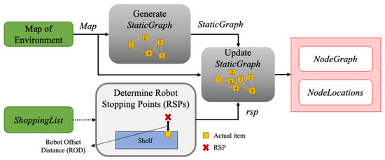 The Undirected Graph function, as shown in Figure 6, utilizes the Map to generate a StaticGraph, which connects all the PEWs not separated by static obstacles of the environment. As mentioned in Section 3.1, the ShoppingList consists of the 2D location of the desired items on the shelf, which is used to determine a stopping point for the CartBot near every item on the shopping list. These points are called Robot Stopping Points (RSPs). The RSP for an item is a point at a distance of the ROD, perpendicularly away from the shelf’s edge nearest to the actual item location. Note that the ROD is set to 0.6 m, considering the size of the CartBot and a safe operating distance. Once the RSPs for all the items in the shopping list are determined through the step labeled “Determine RSPs”, they are stored in the rsp variable. Then, rsp is added to the StaticGraph, and a new set of connections are made between the RSPs and PEWs. The result of this process is a NodeGraph along with the NodeLocations.