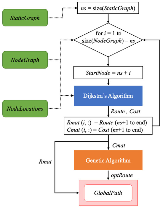 It explains how the shortest path is planned given the NodeGraph and NodeLocations. Figure 7 gives an overview of all the steps in the global path calculation. This function is divided into two phases. In Phase 1, the DA is employed to find the best travel route, Route, and the travel distance of this route, Cost. The Route contains the shortest path from a given starting node, called StartNode, in the NodeGraph to all the other nodes. The Cost contains the Euclidean distance to travel the shortest path from the given starting node in the NodeGraph to all the other nodes. The DA is iterated with each RSP (obtained by the Undirected Graph step) as a StartNode, along with the NodeGraph and NodeLocations, to determine the Route and Cost to the every other node in the NodeGraph. Furthermore, all the Route and Cost from one RSP to all other RSPs is determined and saved as route matrix and cost matrix, called Rmat and Cmat, respectively. After the DA completes the run for all the RSPs, the Cmat formulated is fed into Phase 2.