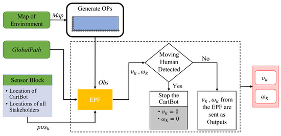 Figure 8 provides an overview of the local planner. The local planner is an online/real-time process that attempts to follow the GlobalPath while making complex decisions in regard to obstacle avoidance. The local planner is implemented at each time step to determine the best path for keeping a safe distance from static and/or dynamic obstacles. The local planner primarily utilizes the EPF algorithm based on multiple input parameters. These include the Obstacle Points (OPs) of all the static obstacles obtained using the Map information, called obs, the goal information from the GlobalPath, and the locations of all stakeholders (pos) provided by the sensing information in the Sensor block. The stakeholders include human shoppers, employees, and other CartBots. Note that the Sensor block primarily focuses on providing information about dynamic obstacles, which are the stakeholders in this study, since the environment map information is known and fixed.
