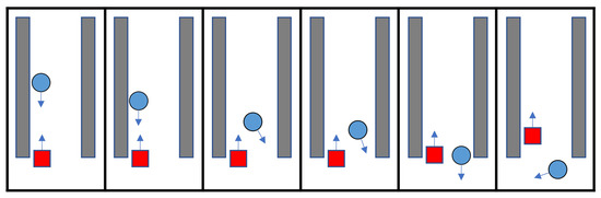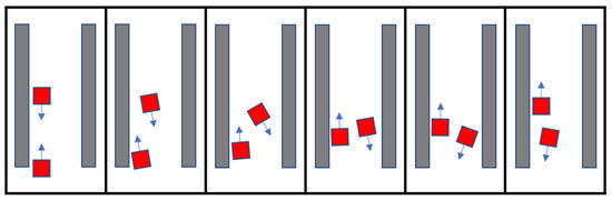 First, a scenario where the CartBot encounters another CartBot as an obstacle is considered, implying that the robots are facing each other and traveling in opposite directions. This is called “robot–robot interaction”. When such a situation arises, the EPF is triggered for both robots, causing them to cooperatively avoid each other and continue on their original path, as depicted in Figure 9.