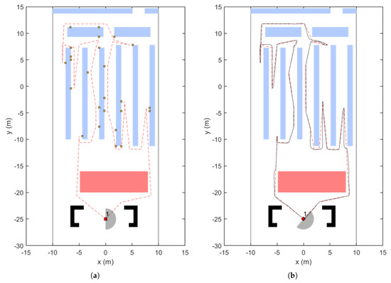 Firstly, the proposed approach is tested in a single-agent environment with no dynamic obstacles. That is, all the obstacles are static, allowing us to focus on analyzing the proposed system’s performance. At the start of the simulation, the CartBot is placed in a shopping environment, as shown in Figure 11a. It can be seen that the calculated near-optimal global path, with a path length of 168.394 m, goes through all the item locations on the shopping list provided to the CartBot. Note that the CartBot is depicted as a red square, the shopping list items are shown as orange points on the shelves, and the red dotted line represents the calculated global path.