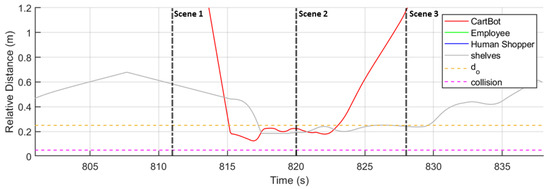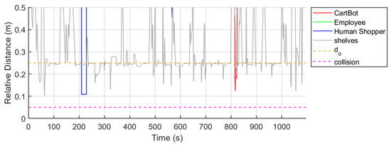 Figure 14 shows the relative distance history of the CartBot from both static and dynamic obstacles. One can observe that the CartBot successfully avoids collisions with the shelves, human shoppers, store employees, and other CartBots. This demonstrates the effectiveness of the local planner in avoiding all types of obstacles while still following the global path.