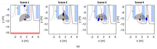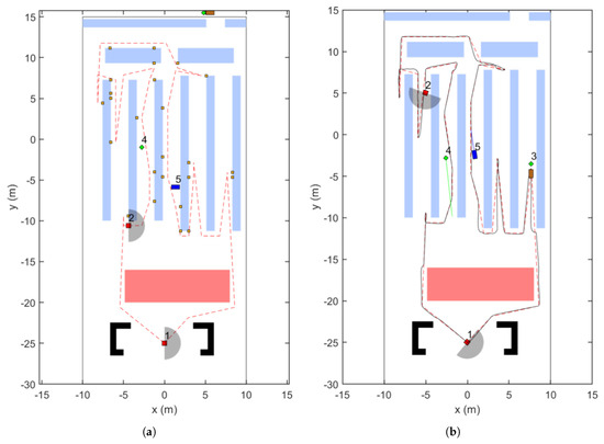 In the previous scenario, the CartBot successfully navigates a shopping environment with only static obstacles. In this subsection, the proposed approach is further evaluated in a more complex environment that includes both static and dynamic obstacles. The objective is to analyze the CartBot’s behavior around dynamic obstacles. The Global Planner generates a path to collect all items, as shown in Figure 13a, similar to the single-agent case. At the start of the simulation, the CartBot (number 1) is positioned at the starting location, and various stakeholders, such as human shoppers (number 5), store employees (numbers 3 and 4), and another CartBot (number 2), are dynamically interacting with the environment. Due to these interactions, the total path length is measured as 170.924 m, which is slightly longer than in the static-obstacles-only scenario.