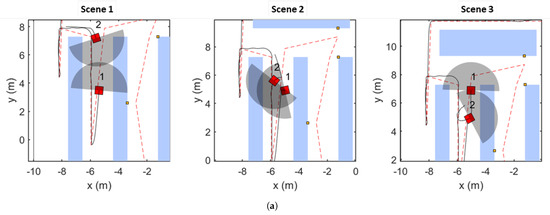 Figure 16 illustrates a robot–human interaction. Scene 1 in Figure 16a shows CartBot 1 is approaching a human shopper with non-zero velocity. The local planner activates the repulsive potential field within the EPF framework to prevent a collision, similar to the robot–robot interaction scenario. In Scene 2 in Figure 16a, CartBot 1 stops as the human shopper enters its moving human detection range, illustrated in Figure 16c. This stop behavior is confirmed by CartBot 1’s velocity trend in Figure 16b. The human shopper is expected to navigate around the robot, which is seen in Scene 3 in Figure 16a. The relative distance plot in Figure 16b shows that the human maintains a safe distance of over 1 m. In Scene 4 in Figure 16a, CartBot 1 resumes following its planned path about 10 s after the human shopper exits the detection range. The complete relative distance history in Figure 16b confirms that the CartBot 1 avoids collisions, highlighting the effectiveness of the proposed approach in dynamic human–robot shared spaces.