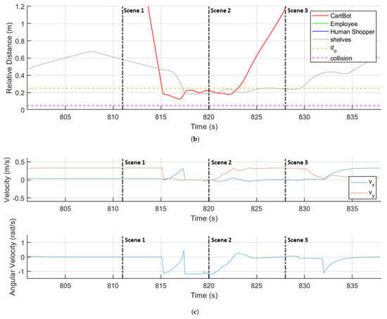 To further validate the performance of the proposed approach, the interactions between the CartBot and other stakeholders are closely analyzed. Figure 15a a shows a sequence of robot–robot interactions between CartBot 1 and CartBot 2. Scene 1 in Figure 15a depicts the moment just before the two robots engage. Both robots are moving toward each other with non-zero velocity, and CartBot 1’s global path is directed toward CartBot 2. At this point, the local planner activates an avoidance maneuver to prevent a potential collision. Scene 2 in Figure 15a illustrates the active interaction between the two robots. They continue to move while executing collision avoidance maneuvers based on the EPF algorithm. The deviation from the global path ensures a safe traversal in the constrained aisle. In Scene 3 in Figure 15a, the robots return to their their respective global paths after completing the avoidance behavior. This highlights the capability of the proposed approach to maintain safety in a constrained space like shopping aisles, between two shelves. Figure 15b,c show the CartBot 1’s relative distance, velocity, and angular velocity. From the relative distance trends, it is evident that CartBot 1 avoids both CartBot 2 and the shelves without collisions.