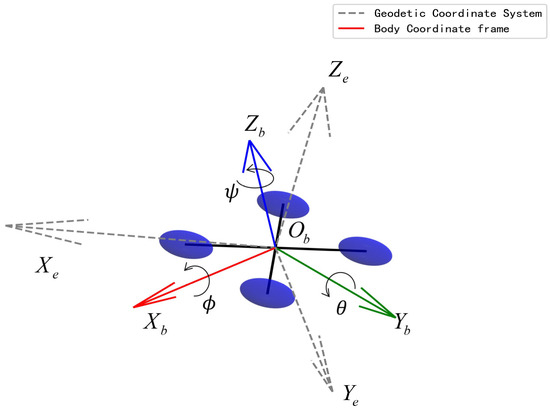 Determining the altitude and orientation of a UAV with six degrees of freedom necessitates the implementation of two coordinate systems: geodetic and airframe coordinate systems. These systems are employed to ascertain the position and attitude of the UAV in flight, utilizing the transformation matrix , as delineated in Equation (1):