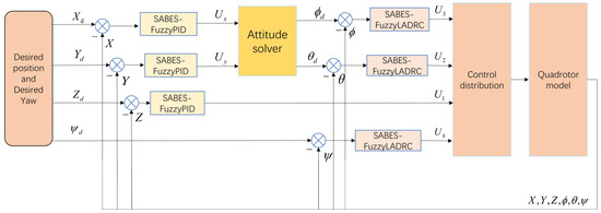 - The flight dynamics model of the quadrotor UAV was developed based on the Newton–Euler equations, which establish the relationship between position, orientation, and the controller. The control structure consists of two loops: the outer loop uses a fuzzy PID controller optimized by the SABES algorithm, while the inner loop utilizes a fuzzy LADRC, also optimized by the SABES algorithm. The adaptability of the LADRC controller, which does not require an exact model, helps to minimize the impact of nonlinear characteristics on the control strategy. Additionally, the influence of multivariate characteristics is reduced through the use of the SABES optimization algorithm in conjunction with the ITAE optimization objective function, serving as a co-optimization method for the entire system.