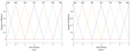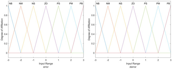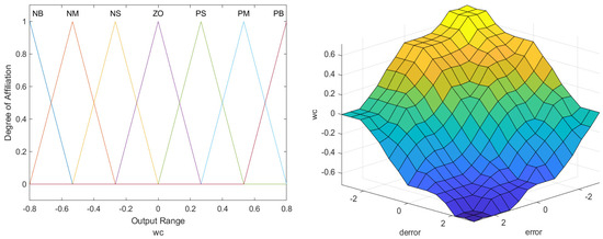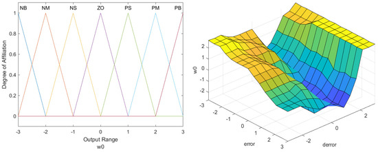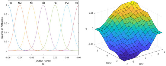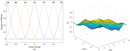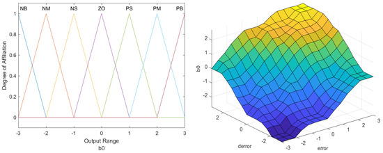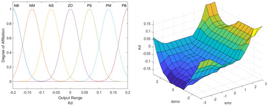 After optimizing the initial PID parameters using the SABES algorithm, a fuzzy controller is added to enable real-time dynamic adjustment of the PID parameters, thus improving the system′s anti-interference capability. The “trimf” membership function is selected for input and “gaussmf” for output, and the fuzzy rule table is shown in Table 2.