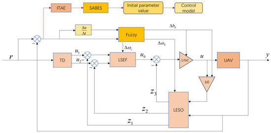 The attitude controller is a fuzzy control second-order LADRC, optimized using the SABES algorithm, as shown in Figure 13. Unlike the conventional LADRC, this controller combines the SABES algorithm with fuzzy control. The SABES algorithm plays a crucial role in optimally selecting the initial parameters for the LADRC. In contrast, the fuzzy control modifies the LADRC parameters in real time to respond effectively to external uncertainties and disturbances. The components of the LADRC controller include a tracking differentiator (TD), a linear extended state observer (LESO), and a Linear State Error Feedback (LSEF) mechanism.
