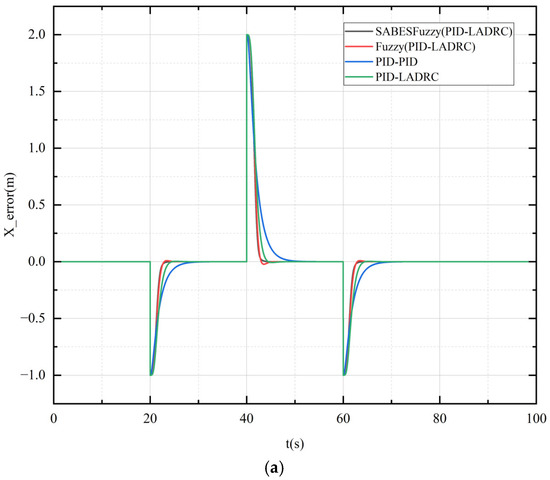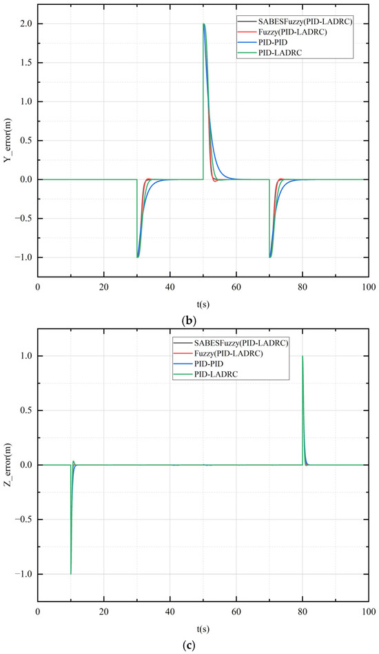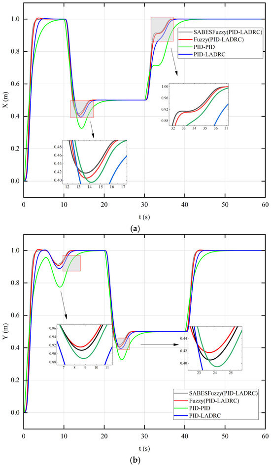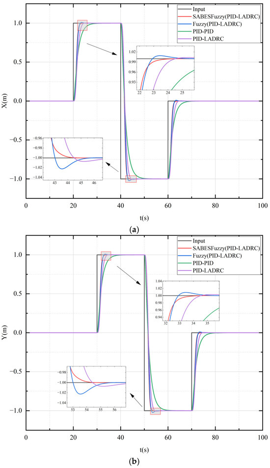 As shown in Figure 15 and Figure 16, in the x-axis direction, the SABESFuzzy (PID-LADRC) controller successfully tracked the desired trajectory from 0 m to 1 m in approximately 4.39 s. In comparison, the Fuzzy (PID-LADRC) controller took 5.09 s to stabilize the tracking of a given signal, and the PID-LADRC and PID-PID controllers required 7.26 s and 12.39 s, respectively, to stabilize and reach the desired trajectory. Notably, the PID-LADRC controller exhibited a slight overshoot of about 0.31%, and the Fuzzy (PID-LADRC) controller exhibited a slight overshoot of about 0.89%, while both the SABESFuzzy (PID-LADRC) and PID-PID controllers achieved the trajectory without any overshoot. Similarly, the SABESFuzzy (PID-LADRC) controller stabilized and tracked the trajectory in approximately 4.17 s over a range of 1 m to −1 m, the Fuzzy (PID-LADRC) controller took 5.41 s, and the PID-LADRC and PID-PID controllers took 7.48 s and 12.67 s, respectively. Additionally, the PID-LADRC controller exhibited a slight overshoot of about 0.73%, and the Fuzzy (PID-LADRC) controller exhibited a slight overshoot of about 2.25%, while both the SABESFuzzy (PID-LADRC) and PID-PID controllers maintained zero overshoot.