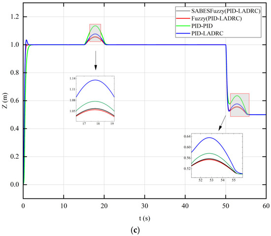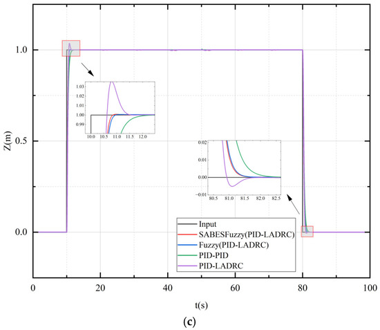As shown in Figure 14 and Figure 15, the SABESFuzzy (PID-LADRC) controller tracked the trajectory from 0 to 1 m in the Z-direction in approximately 1.75 s. In comparison, the Fuzzy (PID-LADRC) took 1.84 s, and the PID-LADRC and PID-PID controllers required 2.3 s and 2.67 s to stabilize and track the desired trajectory. Notably, the PID-LADRC controller exhibited a 3.57% overshoot, while the SABESFuzzy (PID-LADRC), Fuzzy (PID-LADRC), and PID-PID controllers achieved overshoot-free tracking. Furthermore, the SABESFuzzy (PID-LADRC) controller demonstrated excellent performance over the tracking range from 1 m to 0 m, stabilizing in approximately 1.45 s. This represents a significant improvement relative to the Fuzzy (PID-LADRC), PID-LADRC, and PID-PID controllers, which exhibited settling times of 1.50 s, 1.52 s, and 2.08 s, respectively. Moreover, whereas the PID-LADRC configuration experienced a minor overshoot of approximately 0.51%, the SABES-Fuzzy (PID-LADRC), Fuzzy (PID-LADRC), and PID-PID architectures achieved zero overshoot.