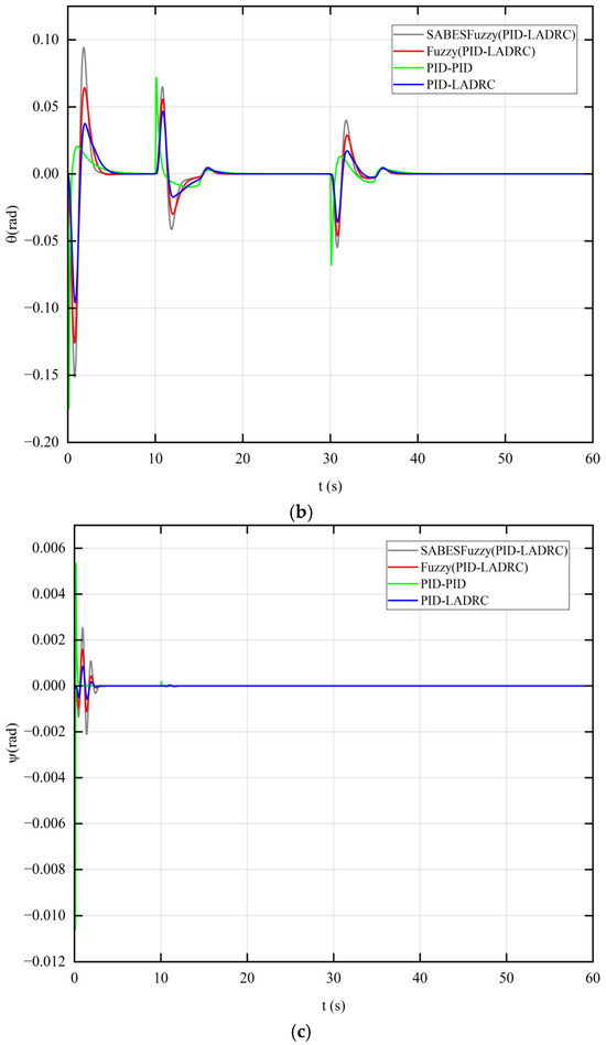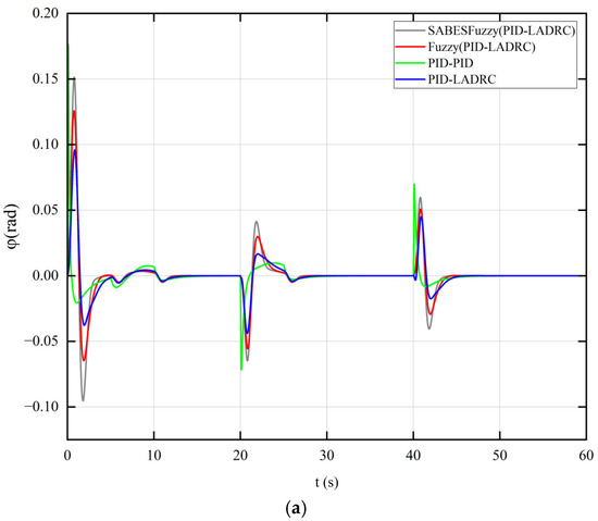 As shown in Figure 17, the integrated PID and LADRC controllers enhanced by fuzzy control, optimized using the SABES, exhibited faster convergence and stronger resistance to wind disturbances under the same level of gust disturbances compared to the conventional dual-closed-loop PID controllers. The latter were less resistant to external perturbations and exhibited slower recovery in tracking speed. As shown in Figure 18, the fast convergence rate of this new controller resulted in frequent motor adjustments, leading to significant changes in the attitude angle. However, the system quickly reached a steady state.