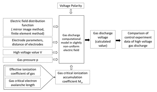 According to the calculation flow chart in Figure 1, the voltage polarity parameters, electric field distribution, electrode parameters, experimental values of the high-voltage part, gas pressure, effective ionization coefficient of gas, and critical electron avalanche length of gas are input into the slightly non-uniform electric field discharge calculation model to calculate the value of gas discharge voltage, which is then compared with the data provided by the high-voltage gas discharge control experiment under the same conditions.