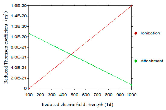 The main collisional cross sections of SF6 were obtained from nl. lxcat.net, and the reduced ionization coefficient and reduced absorption coefficient of insulation gas SF6 were simulated with software Bolsig+ 2016 (see Figure 2), then the reduced effective ionization coefficient could be obtained using Formula (5).