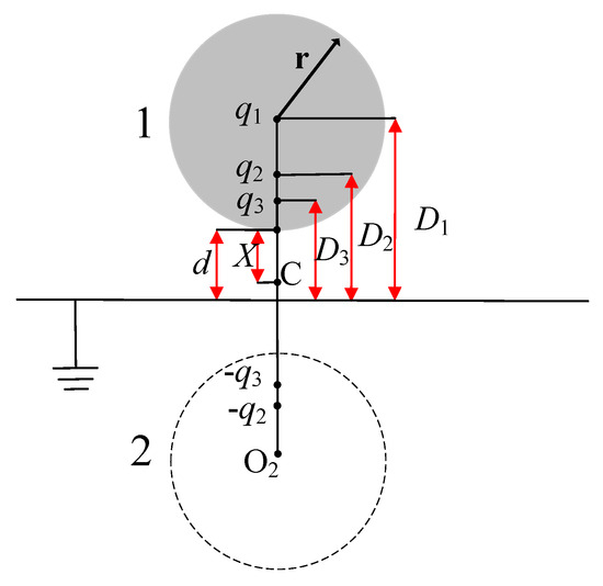 An identical sphere electrode 2, symmetrical to sphere electrode 1, is placed on the opposite side of the flat plane, equivalently distributing the charge on the originally distributed flat plane over sphere electrode 2 such that the original electric field between the sphere and plane is equal to the electric field vector between the two spheres. As shown in Figure 3, the C point in the figure is any point on the electric field of the electrode axis at a distance of X from the spherical electrode 1, a radius of r, and a distance, d, from the plane electrode. Formulas (10)–(12) [18,19,20] can be obtained.