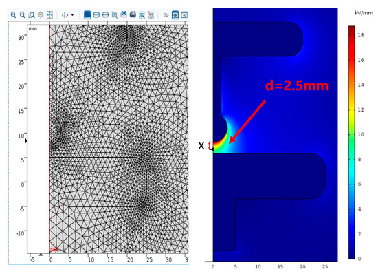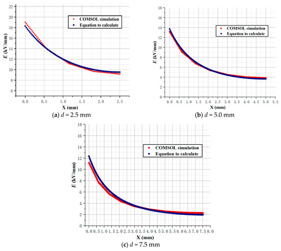 The electric field simulation results are shown in Figure 4 below. It can be seen from the diagram that the maximum electric field strength is at the surface close to the sphere electrode, and further away from the sphere electrode, its electric field strength is decreasing. Let the distance of the spherical electrode from any point on the plane electrode axis to the spherical electrode be X, as shown in Figure 5. It can be seen that the analytical formula derived using the image method gives results that are essentially in agreement with the finite element simulation results. The relationship between the difference in electric field strength values obtained using these two methods and the variable X is shown in Figure 5. It can be seen that the maximum error is around X being 0–0.25 mm. We have provided the maximum error percentage, which is approximately 8.3%.