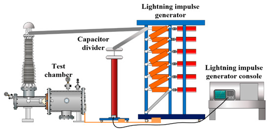 The experimental platform and experimental electrodes are shown in Figure 7 and Figure 8. In order to obtain a breakdown voltage under the impulse voltage, the impulse breakdown test was conducted using the voltage boosting method proposed in IEC 60060-1 [24], with at least 20 effective breakdowns occurring in each group.