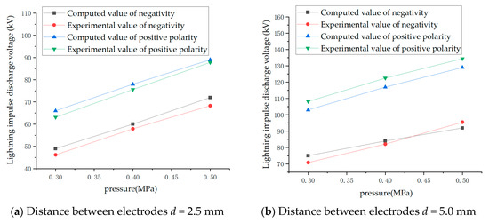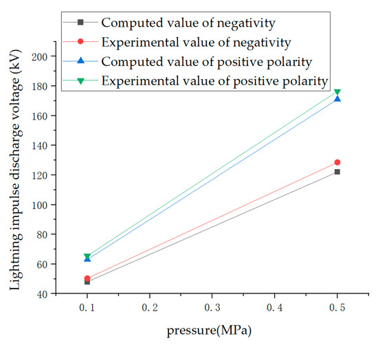 The lightning impulse 50% breakdown voltage of the SF6 gas gap at an atmospheric pressure of 0.1 MPa and a high pressure of 0.5 MPa with a spherical electrode radius of curvature r = 3 mm and sphere–plane electrode spacing d = 5 mm was calculated and compared with the test values. Ss shown in Figure 7, it can be seen that for a typical insulated gas, SF6, the maximum relative error is 5.1%, meeting engineering requirements. The difference between the calculated and experimental results is shown in Figure 9.