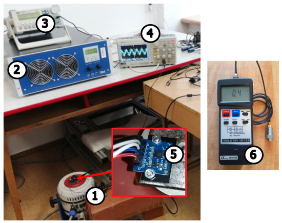View of the test stand: 1—vibration exciter TIRA (TV51140, Tira GmbH, Bialystok, Poland); 2—power amplifier TIRA (BAA 1000, Tira GmbH, Bialystok, Poland); 3—function generator NDN (DF1410, NDN, Bialystok, Poland); 4—digital oscilloscope Tektronix (TBS 1102B, NDN, Bialystok, Poland); 5—accelerometer tested; 6—vibration meter Lutron (VB-8200, Lutron, Bialystok, Poland).