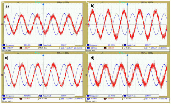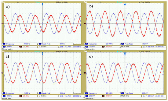 Oscillograms of the sinusoidal waveform from the generator with a frequency f = 20 Hz and a peak-to-peak voltage = 200 mV (Ch1—blue), and the output waveform measured in the Z-axis for the accelerometers: (a)—ADXL335; (b)—ADXL345; (c)—MPU-6050; (d)—MMA7361LC (Ch2—red).