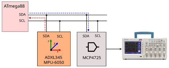 In this experiment, the AVR microcontroller was also used to process signals from digital accelerometers (MPU-6050, ADXL345) communicating via the serial interface. In addition, the MCP4725 chip was used as an external digital-to-analogue converter (DAC) to record the processed signal with an oscilloscope. The wiring diagram is shown in Figure 4. The direction of the data flow is indicated by the dashed lines.