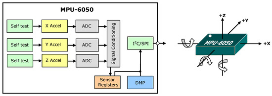 The MPU-6050 digital sensor was selected for the target measurement system. It is also important to consider the measurement range and mounting aspect of the accelerometer. Because the accelerometer is mounted on the engine, a running alternator has the potential to cause interference, affecting the voltage signal from the analogue sensors. The MPU-6050 combines a 3-axis accelerometer, a gyroscope, and a digital thermometer. Its various applications can be found, for example, in the works [29,30,31,32]. A key feature of this sensor is the built-in hardware Digital Motion Processor (DMP), which facilitates the conversion of processed data from all three sensors to a specific position relative to Earth, thus allowing the microcontroller to perform this task [26]. The simplified internal structure of the MPU-6050 is shown in Figure 5.