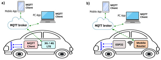 Two MQTT broker communication solutions: (a) vehicle not equipped with a mobile router, (b) vehicle equipped with a mobile router.