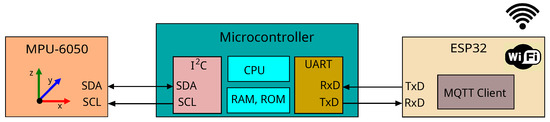 The MPU-6050 communicates with the AVR microcontroller over the protocol, which allows multiple devices to be connected to a single bus consisting of two lines: (“clock line”) and (“data line”). The AVR microcontroller periodically requests sensor readings, calculates several parameters from the measured data, and sends the parameters to the ESP32 board. The communication process consists of the following steps: