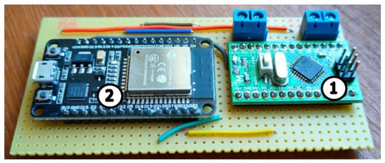 The sensor board: 1—AVR; 2—ESP32 microcontrollers.