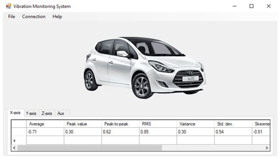 The tests were conducted at normal engine operation and different rotational speeds between 1000 and 3500 rpm with a step of 500 rpm. The values of the measures (4)–(14) for the signal relative to each axis were then calculated in successive 5-second time windows (1000 samples were collected, calculations were then performed, and further samples were then transmitted to the buffer). The results are presented in Table 2, Table 3 and Table 4. They are also available in the client application shown in Figure 12.