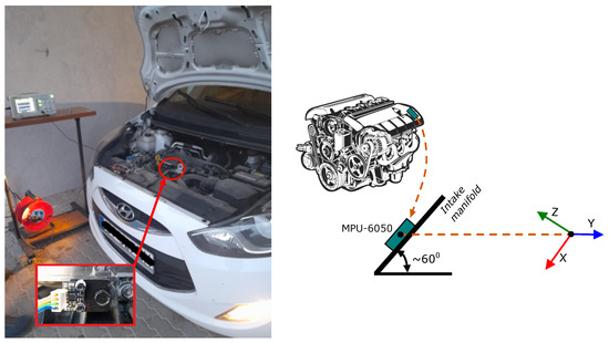 The measurement system was tested on the Hyundai vehicle (Hyundai Motor, Bialystok, Poland) shown in Figure 13. The AVR microcontroller was responsible for calculating the signal from the accelerometer, attached to the engine block on the intake manifold, where a pre-tapped process hole was used. The MPU-6050 was configured with DLPF_CFG = 0x02 in the ACCEL_CONFIG register, which sets its bandwidth at 94 Hz, with a sampling rate of 1 kHz and a delay of 3 ms, and AFS_SEL = 0x03, which sets its maximum measurement range. For the bus, a transmission speed of 100 kHz was configured on the AVR microcontroller and the MPU-6050 by setting the SMPLRT_DIV register to 0x07. Although the sampling rate of 1 kHz would theoretically allow the capture of frequency components up to 500 Hz (according to the Nyquist criterion), the effective bandwidth of the measurement system is limited to approximately 94 Hz due to the configured low-pass filter setting. Consequently, the physical vibration signals that can be reliably acquired and analysed are confined to this frequency range. This limitation is acceptable for the intended application, as the dominant vibration components of internal combustion engines typically occur within the 0 to 100 Hz band. The selected filter setting represents a trade-off between attenuating high-frequency noise and preserving diagnostically relevant signal content. This bandwidth restriction has been taken into account during the design of the system and the interpretation of the acquired data. The sensor mounting angle, relative to the ground, was approximately . However, following the integration of the accelerometer in the PCB, and taking into account the angle mentioned above, a rotation of the axis was obtained.