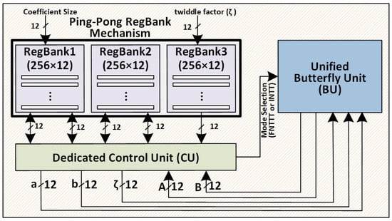 Block Diagram of the Proposed NTT Accelerator Architecture Featuring RegBanks, Unified Butterfly Unit, and Dedicated Control Unit.