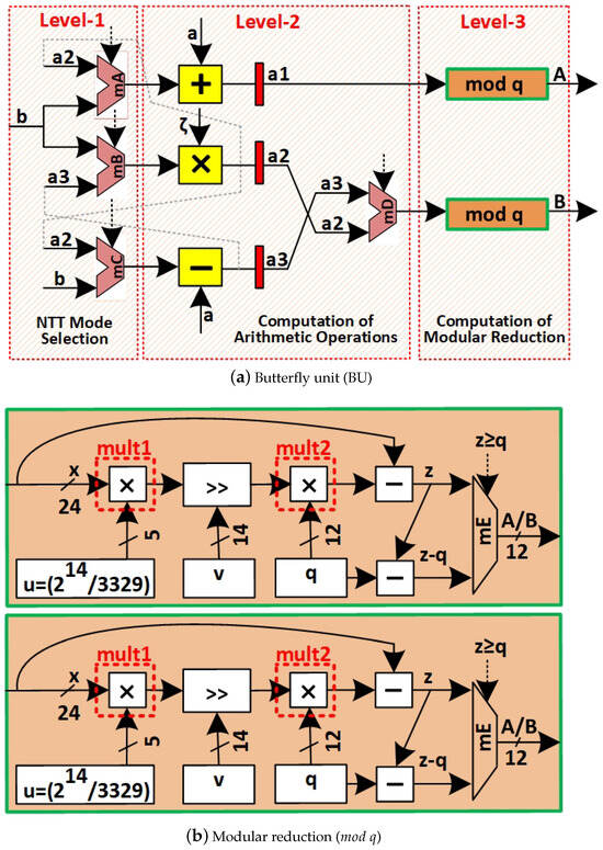 Proposed unified butterfly unit architecture of CT and GS configurations for forward and inverse NTT computations. (a) shows that the design comprises three functional levels: Level-1, Level-2, and Level-3. In Level-1, the control logic determines the computation path based on the selected NTT mode. Multiplexer mB directs the processing flow for FNTT, while multiplexers mA and mC are utilized for INTT execution. Following this, Levels 2 and 3 sequentially perform the necessary arithmetic operations, guided by the selection signals and outputs produced in Level-1. (b) shows the architecture for implementing optimized Barrett reduction algorithm.