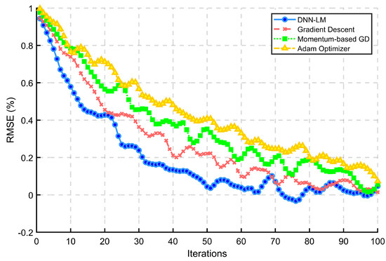 Figure 2 shows the convergence curves for different algorithms. The DNN-LM approach converges faster and with fewer iterations compared to traditional methods.